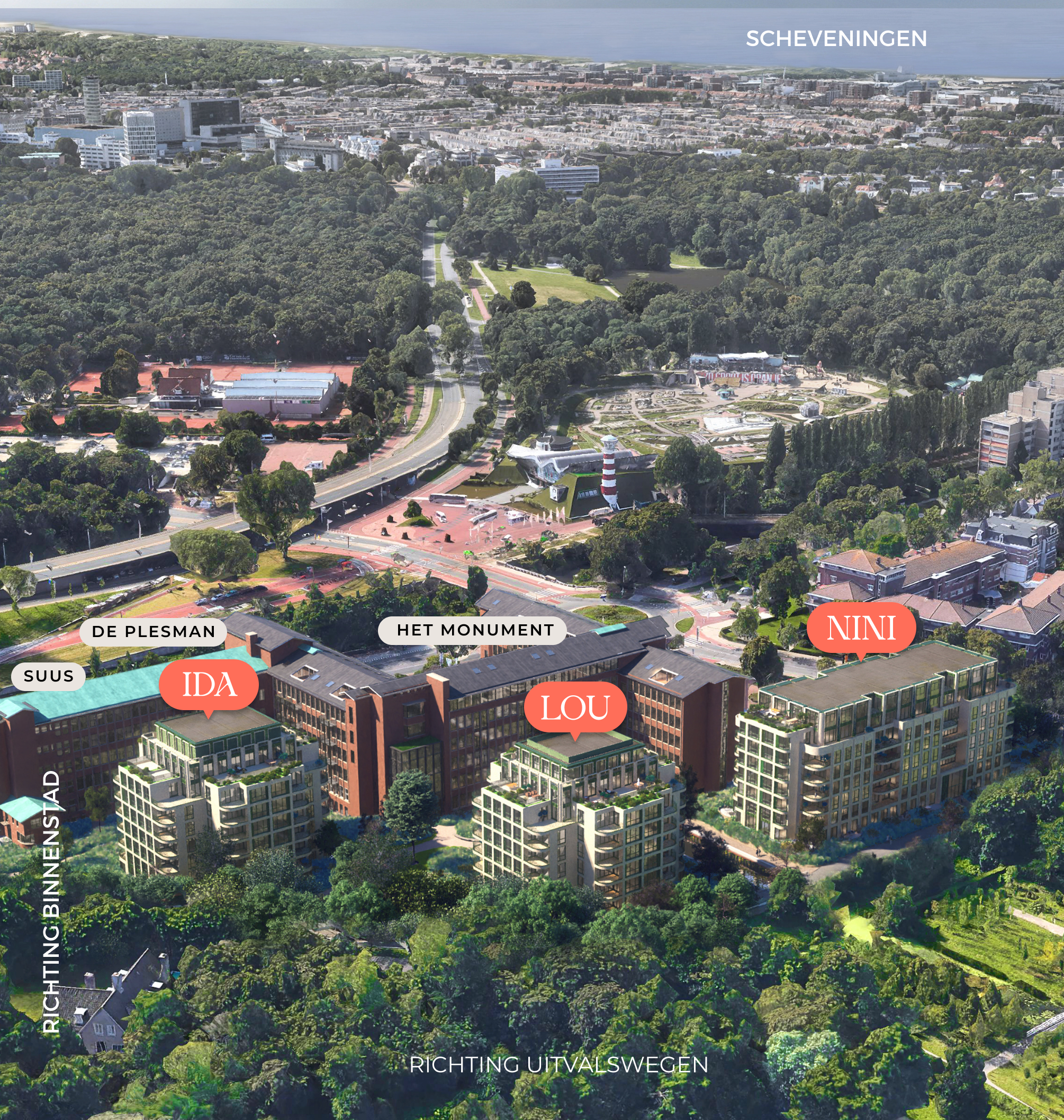 In Plesmanduin woont u in het beste van twee werelden: de rust en ruimte van een groene, duinrijke omgeving én het comfort van hoogwaardige nieuwbouw. De drie nieuwbouwcomplexen – Ida, Lou en Nini – zijn geïnspireerd op de cultuurhistorie van de plek en ontworpen met oog voor kwaliteit, duurzaamheid en woongenot.